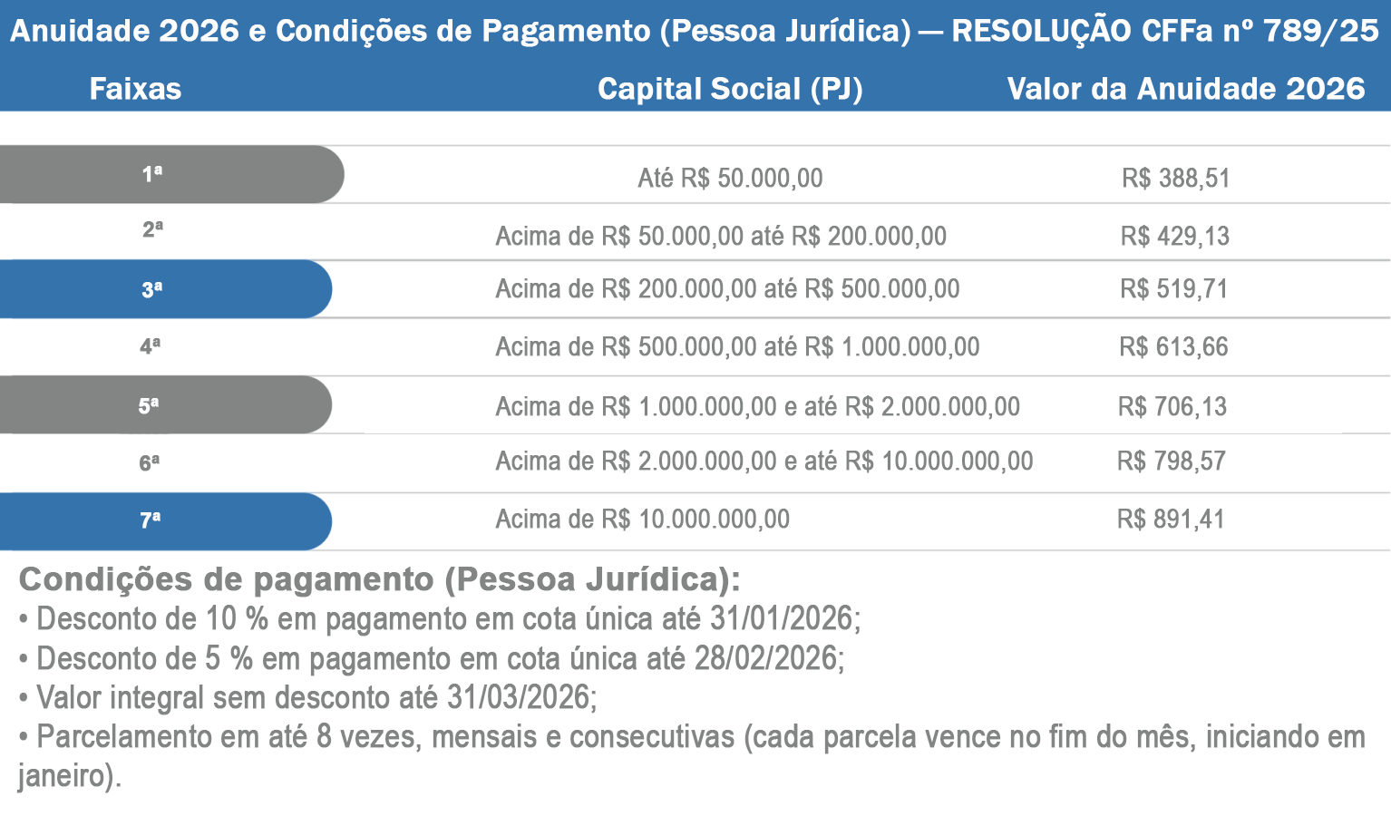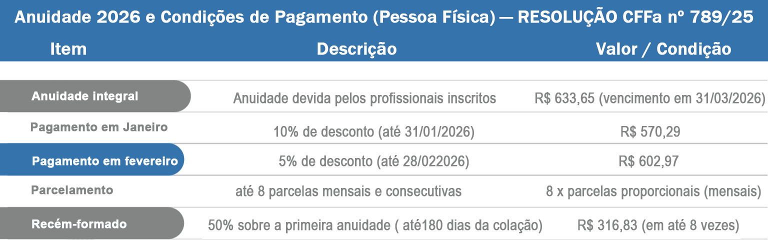 A Resolução CFFa nº 789, de 17 de outubro de 2025, estabelece os valores das anuidades, taxas, multas e as respectivas condições de pagamento para o exercício de 2026.